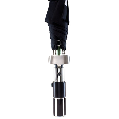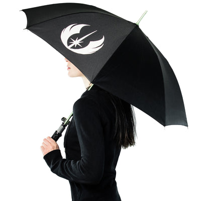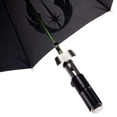 A dire il vero, non è tanto il tempo quanto la forza oscura a turbare i Jedi. Tuttavia, non è sempre facile rimanere di buon umore quando piove. Questo ombrello con il disegno della spada laser di Yoda ti darà nuovo coraggio. Il manico presenta tutti i dettagli dell'originale, mentre l'asta è anodizzata in verde e rappresenta la lama non appena l'ombrello viene aperto. L'emblema argentato dell'Ordine Jedi è visibile due volte sulla parte esterna dell'ombrello.