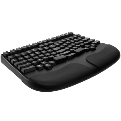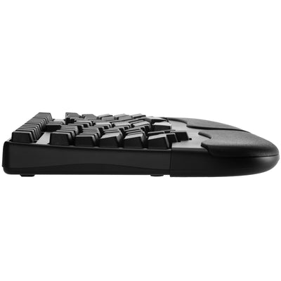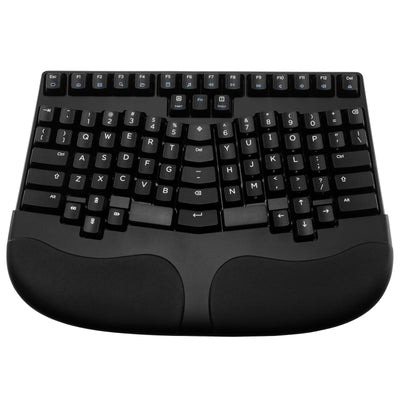 Questa tastiera ha lo stesso numero di tasti di una tastiera convenzionale nel 60% di spazio in meno, senza ridurre i tasti in modo significativo. La disposizione più stretta ti permette di avere una postura migliore e di avvicinare le braccia. Anche la distanza che devi percorrere per raggiungere il mouse si riduce. Il poggiapalle imbottito offre un ulteriore comfort durante le pause dalla scrittura.