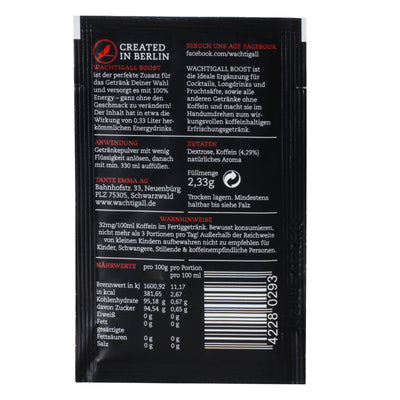 Wachtigall ti dà la carica di energia di cui hai bisogno quando stai iniziando a perdere colpi dopo ore di lavori domestici, lezioni noiose, giochi notturni o attese per le misure. Il grande vantaggio è che non ha il tipico sapore appiccicoso delle bevande energetiche, ma ha un gusto neutro. Puoi mescolare la polvere all'acqua o a qualsiasi altra bevanda. Questo ti aiuta ad aumentare la concentrazione e combatte efficacemente la stanchezza, grazie alla buona vecchia caffeina. :)
