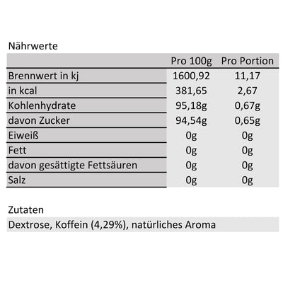 Una bustina contiene 2,33 g con il 4,29% di caffeina ed è sufficiente per circa 330 ml di liquido. Puoi trovare gli ingredienti esatti nella foto. Tuttavia, puoi anche assumerne un po' meno all'inizio, dato che la caffeina agisce in modo diverso su ognuno di noi. Un consumo eccessivo corre sempre il rischio di trasformarsi in una seconda frittura sovraeccitata. In ogni caso, non dovresti bere più di tre porzioni al giorno, a volte è sufficiente il vecchio sonno ;)