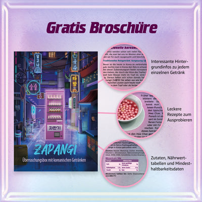 Per aiutarti a orientarti e a conoscere alcune curiosità sulle bevande analcoliche coreane, la Zapangi Box è accompagnata da un opuscolo dettagliato che non solo fornisce informazioni sulle singole bevande e sul contesto culturale, ma include anche una o due ricette.