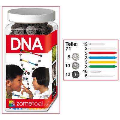 DNADNA (Deutsch: DNS) verbindet alle Lebewesen auf diesem Planeten. Schön und elegant, einfach und kraftvoll: Das ist, was alle Lebewesen auf diesem Planeten verbindet. Dieser „Baustein des Lebens“ kann mithilfe dieses Zometool Bausatzes mit 71 Teilen erforscht werden.