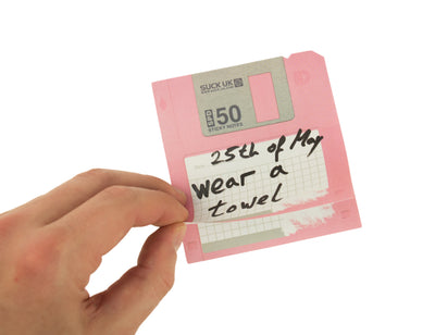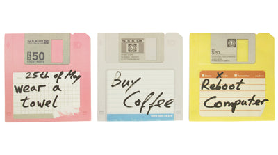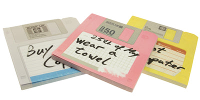 De met elke pen beschrijfbare Floppy Disk Plakbriefjes, waarvan de blaadjes bedrieglijk veel lijken op de diskettes van vroeger, nodigen de nostalgische PC-freak uit om zijn kortetermijngeheugen te ontlasten. Daarmee voldoe je moeiteloos aan alle afspraken van het echte leven, want wie heeft er meer dan 3,5" beschrijfbare opslagruimte nodig? Alles wat daarbovenuit gaat, is het herinneren niet waard ;)