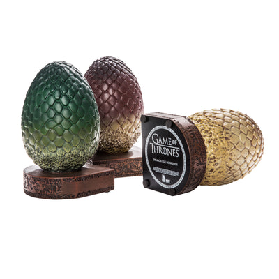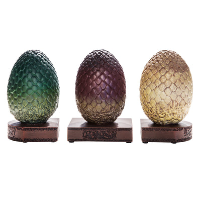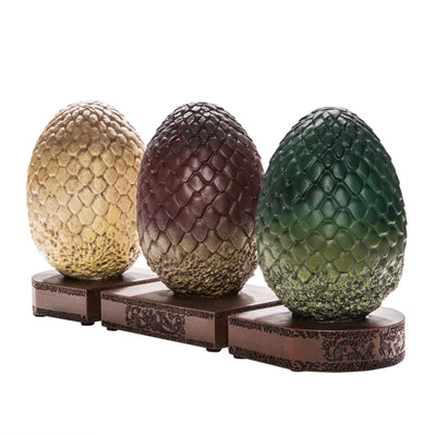 Die Farbgebung ist der von Daenerys Targaryens Eiern nachempfunden. Drogons rötliches Ei hat seinen Platz zwischen denen seiner Geschwister Rhaegal (grün) und Viserion (cremefarben). Die Eier sind pflegeleicht, da Du sie nur ab und an abstauben musst - aber stelle sie lieber nicht allzu nah an ein offenes Feuer. ;)
