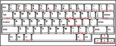- het toetsenbord is bijzonder klein, zodat onnodige vingerbewegingen het typen niet vertragen. Een extra functietoets (Fn-toets) biedt, net als bij een laptop, extra toetsfuncties (zie extra afbeeldingen van het artikel, de rode markering geeft de functie van de Fn-toets aan).