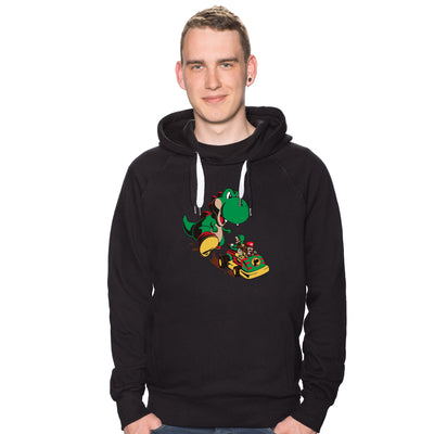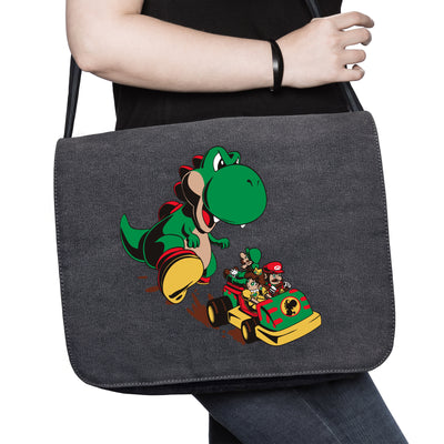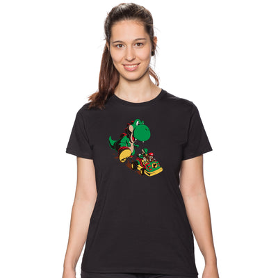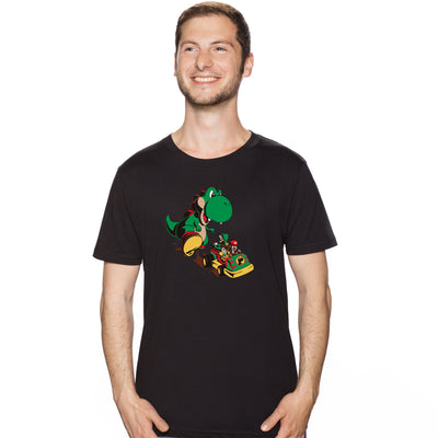Precies zo'n situatie (gelukkig zonder Goldblum) toont het "Jurassic Kart"-T-shirt: De Italiaanse loodgieters Mario en Luigi racen samen met prinses Daisy in een kart weg voor hun ooit schattige en onschuldige huis-sauriër Yoshi. Want deze is gegroeid tot de grootte van een T-Rex en wil nu eens proberen hoe loodgieter-carpaccio smaakt. De legendarische geit heeft blijkbaar niet lang standgehouden. ;)