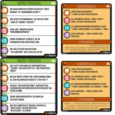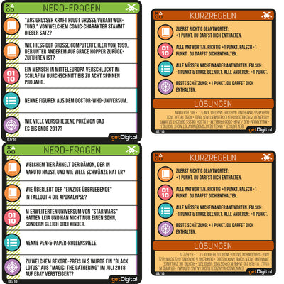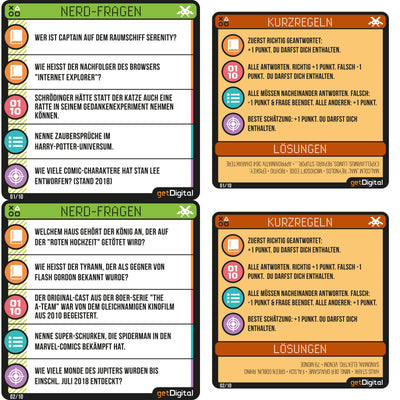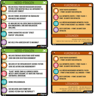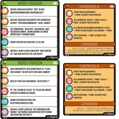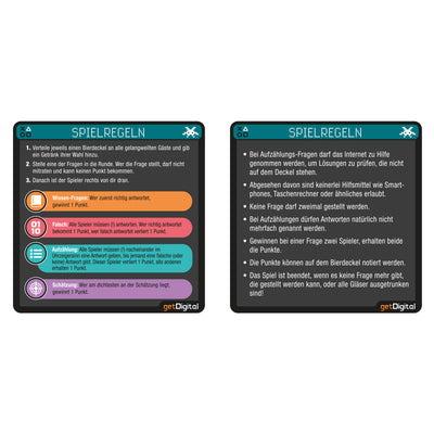 Op deze elf kleurrijke bierviltjes vind je naast een handleiding allerlei vragen uit de bovengenoemde categorieën, waarin je je kennis kunt bewijzen. Zodat je vrienden ook een kans hebben, zijn er niet alleen 'normale' vragen opgenomen, maar ook schattings-, groeps- en opsommingsvragen. Dus als iedereen bij het volgende bedrijfsfeest alleen maar naar de grond kijkt of nerveus het etiket van het bier afpeutert, kun je vanaf nu meteen voor een goede sfeer en plezier zorgen! :)