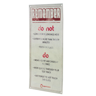 • Metalen bord met gedragsregels van de Aperture Science Laboratories uit het spel Portal 2