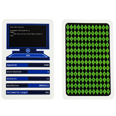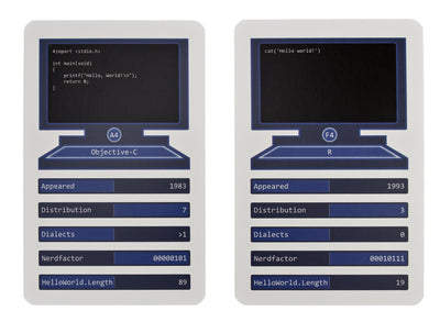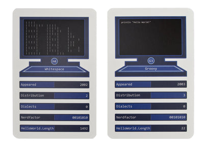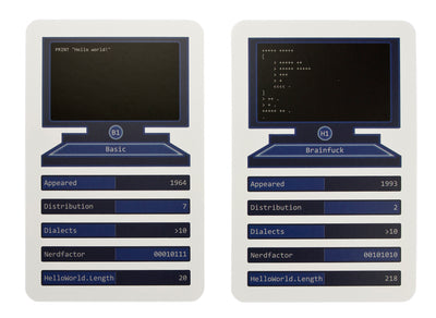 Op 32 speelkaarten staat een selectie van bekende en minder bekende programmeertalen, zelfs uit het gebied van "Esoterie". In typische Supertrumpf-stijl kun je ze dan in verschillende categorieën tegen elkaar laten strijden: