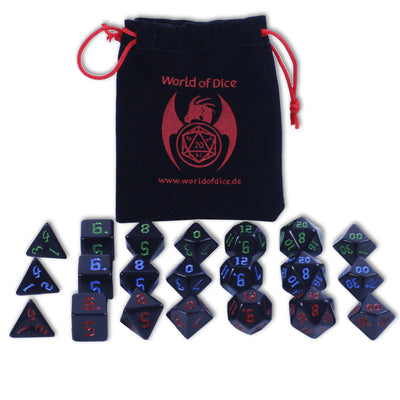 Die RPG Würfel im Beutel sind in schlichtem Schwarz gehalten, sodass die bunten Zahlen noch mehr leuchten und somit leicht zu erkennen sind. Wie es sich für wirklich gute Würfel gehört, liegen sie angenehm in der Hand und lassen sich leicht werfen. Natürlich bekommst du gleich alle sieben Würfelarten, um für jede Art Pen & Paper gerüstet zu sein, egal ob D & D, Shadowrun oder DSA. Der schicke Beutel sorgt dafür, dass du sie jederzeit mitnehmen kannst, wenn das Abenteuer ruft.