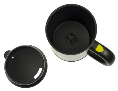 Trouwens: In de Zelfroerende Beker blijft je koffie of cacao ook heel lang heet, want hij wordt geleverd met een thermodeksel. Door een rubberen ring aan de rand van het deksel sluit de beker goed af en valt het deksel er niet uit. Toch kun je nog steeds bij je koffie: er is een uitsparing om te drinken en een luchtgaatje aanwezig.
