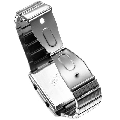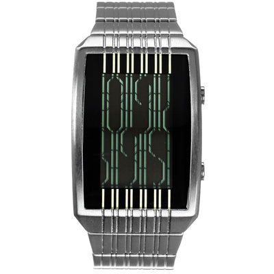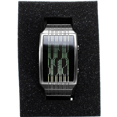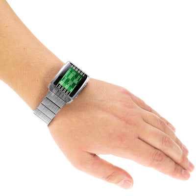 De gemakkelijk te begrijpen handleiding bevat alles wat je moet weten om ook de cryptische variant te kunnen uitlezen en helpt bij elk afzonderlijk cijfer. Twee knoppen aan de zijkant maken het instellen van het horloge, dat in de 12-uursmodus werkt, kinderlijk eenvoudig en de praktische groene achtergrondverlichting zorgt ervoor dat je het horloge altijd kunt gebruiken. Uiterlijk in de animatiemodus, waarin afzonderlijke segmenten op het display bewegen, zullen de blikken je zeker niet ontgaan! Ook de datum kan met een druk op de knop worden afgelezen en er is ook een alarmmodus aanwezig.