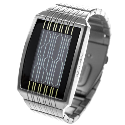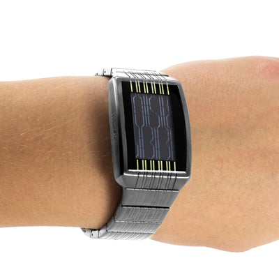 Verticale lijnen, die voor onwetenden als cryptische tekens lijken, maken dit horlogedisplay tot iets heel bijzonders. De op deze manier weergegeven cijfers zijn op het eerste gezicht niet te herkennen, maar voor geoefende ogen geen probleem. Beweeg je pols met een snelle draai en het horloge schakelt over naar een eenvoudigere modus, waarin de tijd sneller kan worden afgelezen. Het horloge heeft een heel bijzondere trillingssensor ingebouwd die dit mogelijk maakt. Het is altijd weer leuk om de verbaasde blikken van andere mensen te zien wanneer je de tijd afleest op het ogenschijnlijk verwarrende display. :)