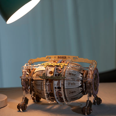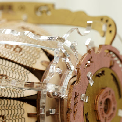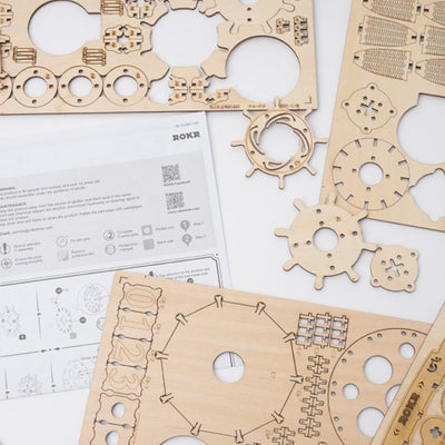 Dazu kommt der Stolz, den Du bestimmt darüber empfindest, das Stück selbst zusammengebaut zu haben. Das geht zum Glück leichter, als es aussieht. Die vorgestanzten Holzteile werden teils zusammengesteckt, teils geklebt, wie in der detailliert bebilderten, englischen Anleitung beschrieben. Für den Aufbau wirst Du etwa drei Stunden brauchen, aber diese Zeit vergeht sicherlich wie im Flug. ;)