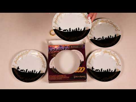 „Een bord, om ze te knechten…“ – oké, misschien niet helemaal. Maar wie zijn maaltijden in de stijl van Midden-aarde wil vieren, vindt in de De Lord of the Rings set van 4 borden en servetringen de perfecte metgezel voor het volgende feestmaal in de taverne – of gewoon voor het diner thuis met vrienden. Of het nu ontbijt in de Gouw is of tweede ontbijt in Rivendel: Met deze borden dineer je stijlvol als een lid van de Reisgenoten.