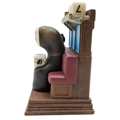 Das Diorama zeigt natürlich die zwei wichtigsten Figuren aus dem Studio Ghibli-Film: Die mutige Chihiro neben dem dämonischen Gott Ohngesicht auf ihrer seltsamen Zugfahrt über das Meer. Wenn du ihre winzigen Begleiter nicht finden kannst, schau mal auf den Würfel, den Ohngesicht hält... ;)