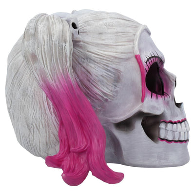Diese morbide Raumdeko Daddy's Lil Monster Schädel wäre ganz nach ihrem Geschmack: Genau die richtige Mischung aus düster und girly. Der Deko-Schädel ist der Struktur eines menschlichen Schädels inklusive Haaren nachempfunden. Diverse schwarze, pinke und auch weiße Details erinnern an das explosive Teufelsweib an der Seite des mordlustigen Clowns. Für alle, die insgeheim immer für die Bösewichte fiebern, perfektioniert dieser Schädel das Antihelden-Sammelregal.