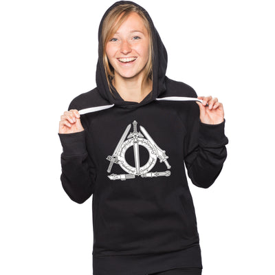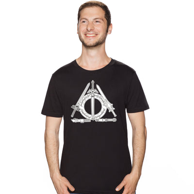 Das T-Shirt "Die Schwerter des Todes" zeigt eine kreative und detailreiche Darstellung ikonischer Waffen und Artefakte aus verschiedenen populären Franchises, die in einer Formation angeordnet sind, die an die Heiligtümer des Todes aus dem "Harry Potter"-Universum erinnert. Das zentrale Motiv des Shirts ist ein großes Dreieck, in dem sich das "Sword of Omens" aus "ThunderCats", das "Power Sword" von He-Man aus "Masters of the Universe", der "Sonic Screwdriver" des elften Doktors aus "Doctor Who", das rote Lichtschwert von Darth Vader aus "Star Wars", das "Master Sword" aus "The Legend of Zelda" und der "One Ring" aus "Herr der Ringe" befinden.