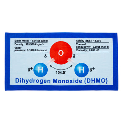 Aber weißt Du eigentlich, was Du Dir damit genau antust? Zum Glück führt Dir das Dihydrogenmonoxid-Strand- und Badehandtuch vor Augen, was Wasser so alles kann: Du erfährst beim Abtrocknen oder Sonnen die Molmasse, die Dichte, den Dampfdruck, den Säuregehalt, die Wärmeleitfähigkeit sowie die Viskosität des erquickenden Nasses. Von der bedrohlich wirkenden Bezeichnung "Dihydrogenmonoxid" darfst Du Dich aber nicht abschrecken lassen, dahinter verbirgt sich auch nur H20. Aber mit ungewöhnlichen und kompliziert klingenden Begriffen kann man ja bekanntlich eine Menge Leute verwirren. ;)
