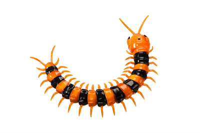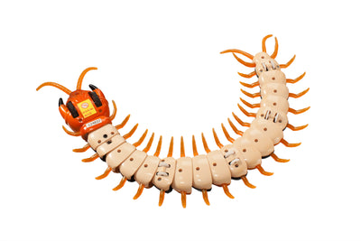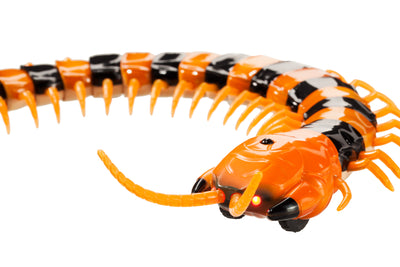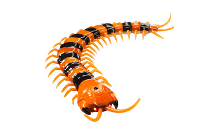 Die Nachbildung, die Du auf den Produktbildern siehst, ist ca. 40cm groß und wird mittels Infrarot-Signal durch eine Fernbedienung gesteuert. Während der ungefährliche Hundertfüßer durch die Gegend rennt, rasselt sein Hinterteil und seine Augen leuchten in furchteinflößendem rot. Fast schon erschreckender als die echten... ;)