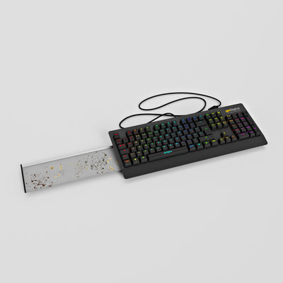 Das Krümelfach bietet hier Abhilfe: Kleine Essensreste, die durch die Ritzen zwischen den Tasten fallen, landen in der flachen, unscheinbaren Schublade, die zur Reinigung ganz einfach herausgezogen und ausgeleert werden kann. Und falls angeschmolzene Schokoladenreste, klebriges Honigbrot oder ähnliches Rückstände hinterlassen haben, kann die Schublade (ausschließlich diese!) sogar in der Spülmaschine gereinigt werden. Feiner Staub, der sich lediglich auf den Tasten ablagert, stellt natürlich weiterhin ein Problem dar. Der Cyber Clean, der ebenfalls in unserem Shop erhältlich ist, schafft hier zuverlässige Abhilfe.