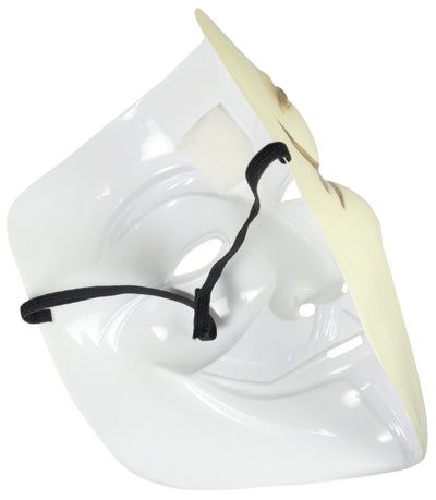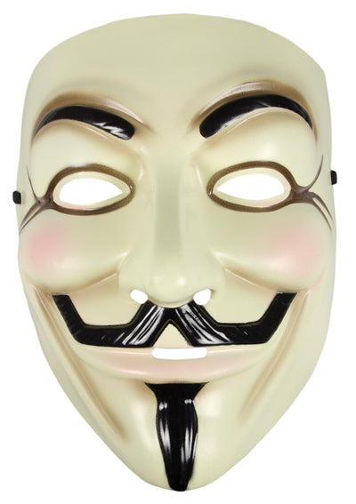 • Maske mit dem Gesicht von Guy Fawkes, mit Gummiband zur Befestigung.
