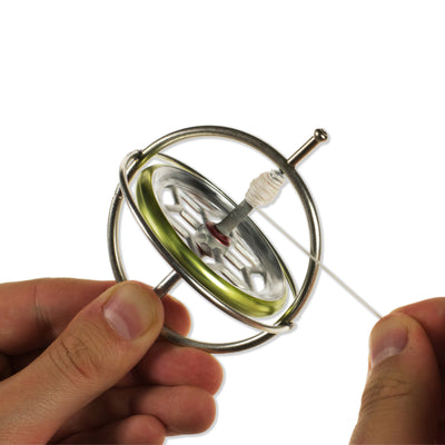 Man kann diesen Kreisel auf jeder beliebigen Ecke drehen lassen, z.B. auf dem beiliegenden Podest, aber auch auf der Spitze eines Stiftes, auf der Kante eines Glases und vielem mehr. Wenn du richtig gut bist, dann kannst Du das Gyroskop sogar auf einer straff gespannten Schnur balancieren lassen! Je langsamer es wird, umso mehr neigt es sich zur Seite und man wartet nur darauf bis es ganz kippt - allerdings wartet man nahezu vergeblich, denn selbst bei einem Abknickwinkel von 90° fällt es nicht vom Sockel - yay, Science!