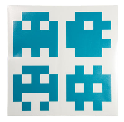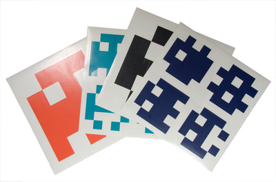 Eine Packung enthält 16 kleine (14x14cm) und 4 große (28x28cm) Aufkleber in verschiedenen, aus Pixeln zusammengesetzten Formen in den Farben Schwarz, Dunkelblau, Türkis und Orange-Rot. Wie Du es von unseren Aufkleber gewöhnt bist, sind sie selbstklebend wieder ablösbar. Eine Klebeanleitung in Deutsch und Englisch liegt bei.