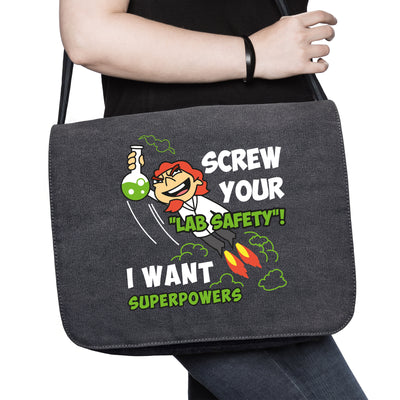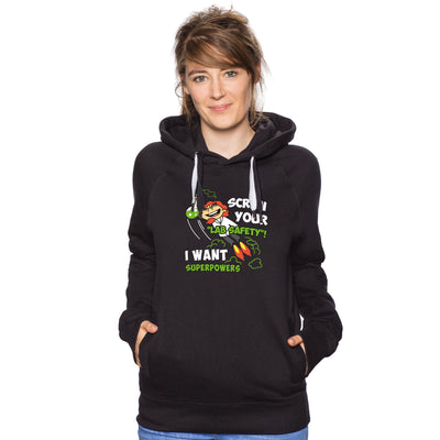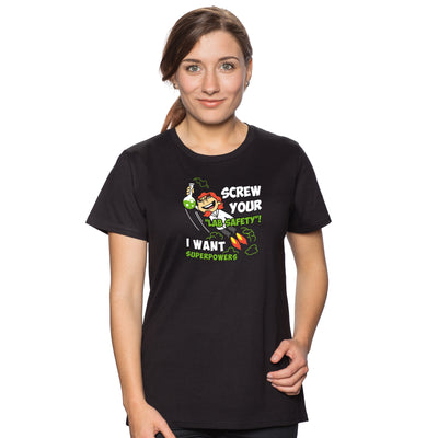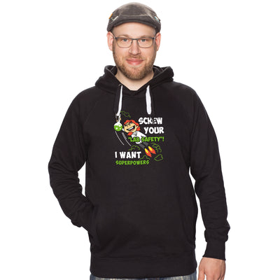 Wenn auch Du der Meinung bist, dass sogenannte "Sicherheitsvorschriften" in Laboren nur dazu dienen, Dich davon abzuhalten, ein Superheld (oder Superschurke) zu werden, kannst Du mit dem "I want superpowers"-Shirt gegen diese Unterdrückung protestieren. Und falls Deine Vorgesetzten sich immer noch quer stellen, musst Du die Dinge halt selbst in die Hand nehmen. So ein Erlenmeyerkolben fällt aber auch einfach leicht runter. ;)