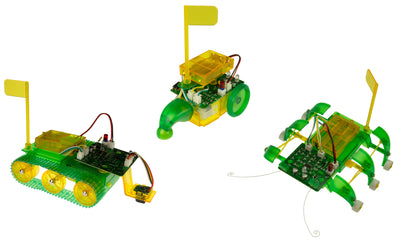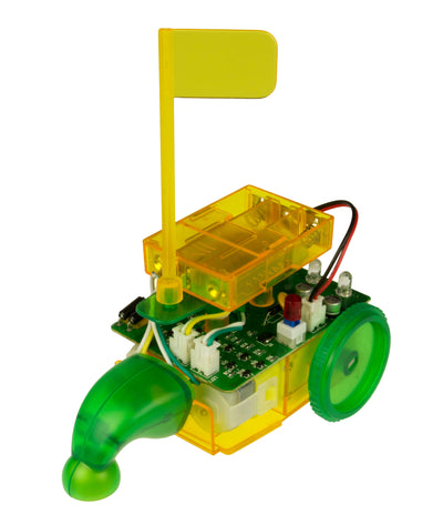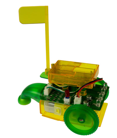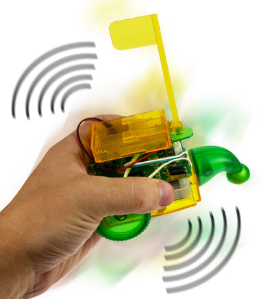 Der Shake Shake Robot hingegen ist mit seiner Anhänger-Optik und einer Länge von 12cm der auf den ersten Blick unscheinbarste, aber womöglich auch interessanteste Vertreter der Roboterfamilie. Sein Fahrtweg wird programmiert, indem man den Shake Shake Robot zuvor schüttelt. Jede Art zu schütteln entspricht dabei einer bestimmten Fahrtbewegung. Bis zu 15 Befehle kann der Shake Shake Robot speichern, somit steht auch komplexen Manövern nichts im Weg. Er ist die beste Wahl für kleine Wettbewerbe oder sogar Minigolf.
