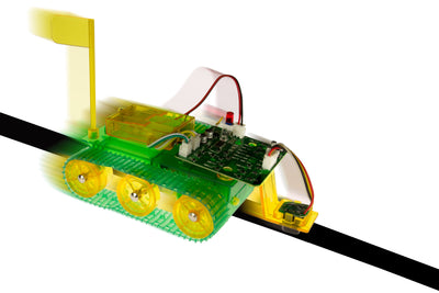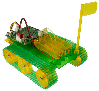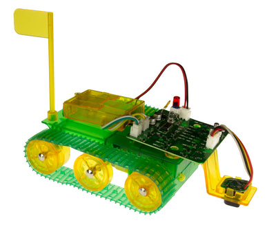 Der Dark Line Tracer ist ein panzerähnliches Gefährt mit einer Länge von ca. 17,5cm, das sich durch seine besondere Linientreue auszeichnet. Wird er an einer gut zu erkennenden, ca. 1cm breiten schwarzen Linie ausgesetzt, ist er Dank seiner zwei Lichtsensoren in der Lage, diese zu erkennen und ihr ergeben zu folgen.