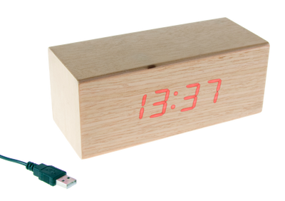 Die LEDs sind übrigens so hell, dass sie ohne Probleme das Holz durchdringen und auch bei Tageslicht sehr gut zu sehen sind. Sie werden per USB mit Strom versorgt. Zusätzlich hat sie eine Batterie, mit der sie Zeit speichert, damit Du die Uhr nicht jedesmal neu einstellen musst, wenn Du den Computer ausschaltest. Die LEDs leuchten allerdings nur im USB-Betrieb.