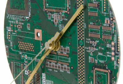 Die Leiterplatten-Uhr ist ein Recyclingprodukt. Sie wurde aus Platinen gefertigt, die tatsächlich einmal im Einsatz waren. Damit geht einher, dass jede Uhr ein Einzelstück ist!