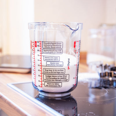 Ohne einen Messbecher wären wir in der Küche aufgeschmissen! Kochen ist zwar ohne genaue Angaben immer irgendwie möglich, beim Backen stoßen wir aber schnell an unsere Grenzen. Und ja, es macht mitunter einen Unterschied, ob Du 300 ml Milch oder "ungefähr 300 ml Milch" in den Teig mischst.