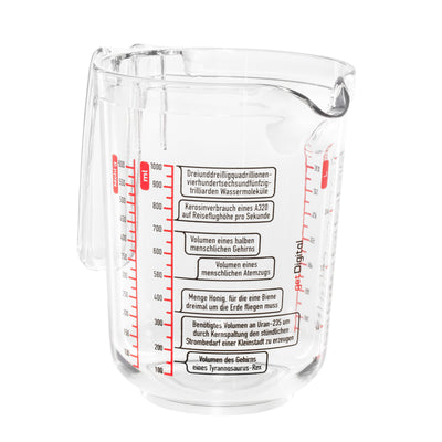 Da Messbecher in der Regel recht langweilig sind, haben wir mit dem Wissenschafts-Messbecher eine Variante entwickelt, bei der Du auch noch jede Menge lernen kannst! Denn neben den üblichen Markierungen für Flüssigkeiten, Mehl und Zucker weist der Becher auch noch 14 Fun Facts auf! Wüsstest Du auf Anhieb, wie viel Kerosin ein A320 auf Reiseflughöhe per Sekunde verbraucht? Oder wie viel Platz 30.000 Reiskörner einnehmen? Ab sofort bist Du für spontane Fragen dieser Art bestens gewappnet! Ein Gummiring im Sockel sorgt außerdem dafür, dass der Becher nicht aus Versehen verrutscht und die Küche unter Wasser setzt.