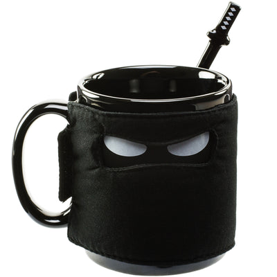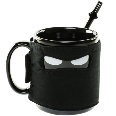Der Becher selbst ist noch recht schlicht. Nur zwei grimmige Ninja-Augen warnen jeden davor, Dein liebstes Heißgetränk zu entwenden. Für noch bessere Tarnung und länger haltende Wärme kannst Du der Tasse eine Maske aufsetzen. Ganz einfach per Klettverschluss, alles lässt sich also auch problemlos separat waschen. :) Außerdem kannst Du den zugehörigen Löffel mit Schwertgriff in die seitliche Tasche an der Haube stecken. Dann sieht jeder, der Ninja hat sein Schwert zugbereit auf dem Rücken.