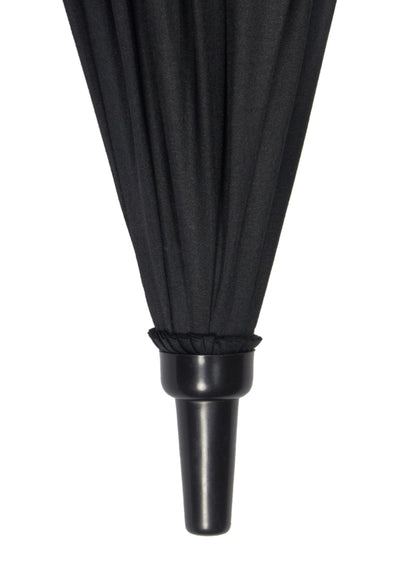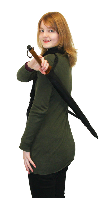 Beim Ninja Regenschirm handelt es sich um einen schwarzen Stockschirm, dessen extra langer Griff aus dekorativ verziertem Holz wie der eines Ninja Schwertes aussieht. Der Ninja Regenschirm ist sehr hochwertig verarbeitet und besteht aus glasfaserverstärktem Kunststoff, Metall, Stoff und Holz. Direkt über dem Griff befindet sich ein Knopf, mit dem man den Schirm automatisch aufspannen kann.