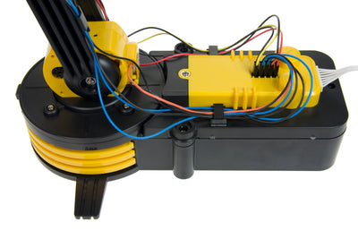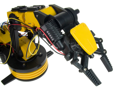 Der Roboterarm hat fünf Gelenke, die alle einen Motor eingebaut haben und einzeln steuerbar sind. Der ganze Arm kann zunächst horizontal um 270° gedreht werden. Direkt auf dem Sockel sitzt das erste vertikale Gelenk - es ist 180° verstellbar. Der Ellenbogen des Arms schafft 300° und das Handgelenk 120°. Der Greifer lässt sich komplett schließen und bis auf 4cm Abstand zwischen den Zangen öffnen.