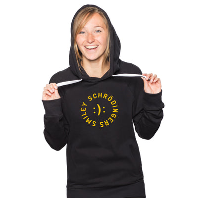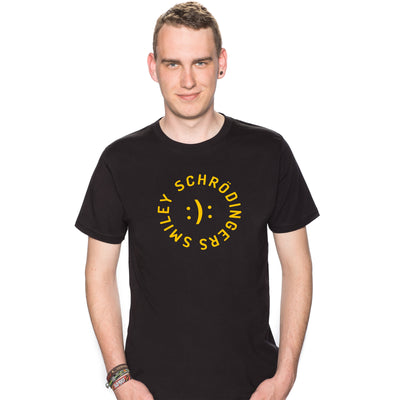 Gleichzeitig glücklich und traurig? Das Design des "Schrödinger´s Smiley" T-Shirts spielt auf das berühmte Gedankenexperiment "Schrödingers Katze" an, das der Physiker Erwin Schrödinger zur Veranschaulichung der Paradoxien der Quantenmechanik entwickelt hat. In diesem Experiment wird eine Katze in eine geschlossene Box mit einer Vorrichtung gesetzt, die sie zufällig töten kann. Nach den Prinzipien der Quantenmechanik befindet sich die Katze in einem Zustand, in dem sie gleichzeitig lebendig und tot ist, bis die Box geöffnet und der Zustand überprüft wird.