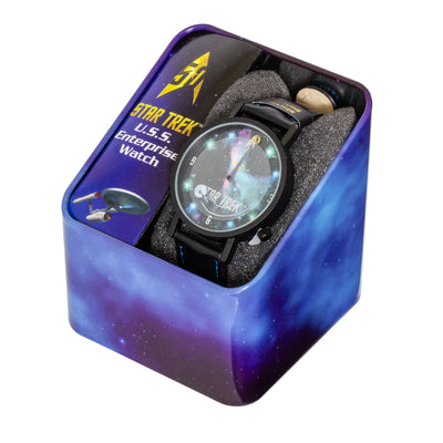 Aber bei den Star-Trek-Armbanduhren handelt es sich nicht nur um schnöde Zeitmesser, sondern um eine geballte Ladung Science Fiction mit echten Raumschiffen! Bei der Enterprise-Armbanduhr dreht nämlich die USS Enterprise neben Stunden- und Minutenzeiger ihre Runden über dem Ziffernblatt!