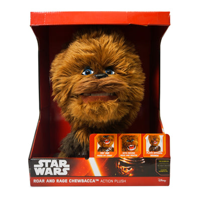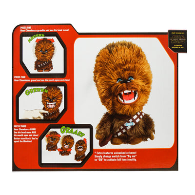 Das Star Wars Chewbacca Kuscheltier mit Sound sieht aus wie sein Film-Vorbild und klingt auch so. Mithilfe der Buttons in Chewies Brustbereich kannst du ihm gleich mehrere Wookiee-Geräusche entlocken, zu denen er auch seinen Kopf und seinen Kiefer bewegen kann. Der redselige Kuschel-Wookiee wird mit 3 AA/LR6-Batterien betrieben, die im Lieferumfang enthalten sind.