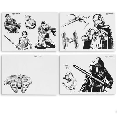 Das Set enthält vier Bögen mit insgesamt 15 Aufklebern. Unter den Motiven findest Du Raumschiffe, BB-8, Chewbacca, einige Stormtrooper und mehr. Was genau, siehst Du auf den Fotos. Hier findest Du auch schon ein bisschen Inspiration. Fünf der Aufkleber sind weiß und damit für dunkle Oberflächen geeignet. Zur Orientierung: jeder Bogen ist 15 x 21 cm groß. Die Aufkleber sind transparent. Falls Dir Kylo Ren auf Deinem Tablet irgendwann mal über sein sollte (was wir uns einfach nicht vorstellen können), kannst Du die Sticker einfach wieder ablösen, ohne die beklebte Oberfläche zu beschädigen. Überlege Dir das aber gut: Nachdem sie erst einmal entfernt wurden, können die Aufkleber nicht wieder angebracht werden. Übrigens machen sich die Motive genauso gut auch auf allen anderen glatten Flächen. ;)