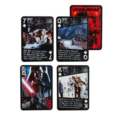 • Die 55 Karten (52 + 3 Joker) zeigen Bilder und Texte, die Darth Vaders Leben nacherzählen