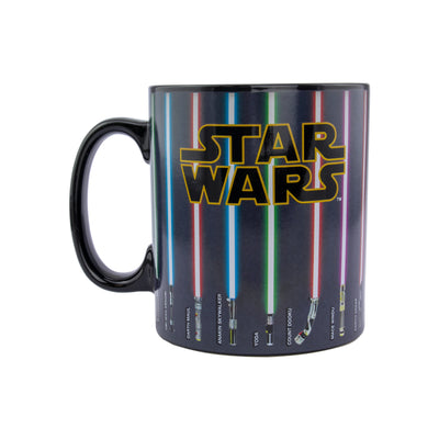 Der Becher fasst bis zu 450 ml und bietet allen berühmten Lichtschwertern und weiteren Waffen aus dem Star Wars-Universum Platz. Im kühlen Zustand bleibt der Becher dunkel und die Waffen gesichert, aber wenn du eine heiße Flüssigkeit hineinfüllst, leuchten die bunten Energiewaffen auf. Ob da nicht doch ein bisschen Macht im Spiel ist?