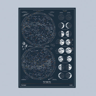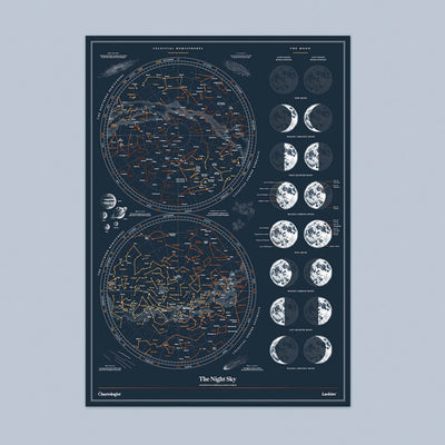 Auf diesem interaktiven Chartologist Scratch-Poster des Nachthimmels kannst du deine Sternbeobachtungs-Fortschritte festhalten. Die zwei großen Darstellungen der nördlichen und südlichen Hemisphäre bilden das Zentrum des Posters; hier sind etliche bekannte Sternbilder ordentlich aufgeführt und mit Namen gekennzeichnet. Wenn du beim nächtlichen Sterngucken eine Konstellation identifiziert hast, kannst du ihre goldene Farbe auf dem Poster mit einer Münze freikratzen und so nach und nach den ganzen Nachthimmel entdecken. Zusätzlich enthält das umfangreiche Poster eine ausführliche Darstellung der Mondphasen. Und wenn es einmal länger bewölkt sein sollte: Das Poster eignet sich nicht nur als interaktive Karte für Sterngucker, sondern auch als originelle Deko für Weltraum-Fans und Astrologiebegeisterte.
