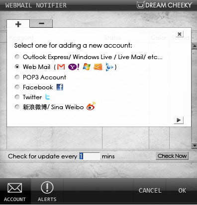 Eine neuere Version des Programms (Download) hat auch die Web-Dienste Hotmail.com, AOL.com und Mail.com voreingestellt. Du kannst damit außerdem mehrere Mailkonten sowie Facebook- und Twitter-Accounts abfragen lassen. Bis zu neun Konten sind gleichzeitig möglich, jedem kann eine eigene Farbe zugewiesen werden.
