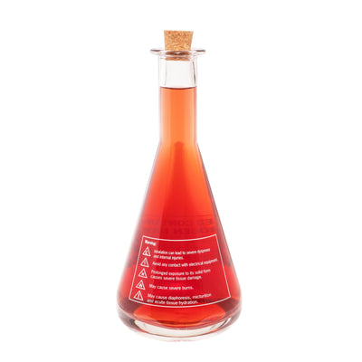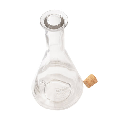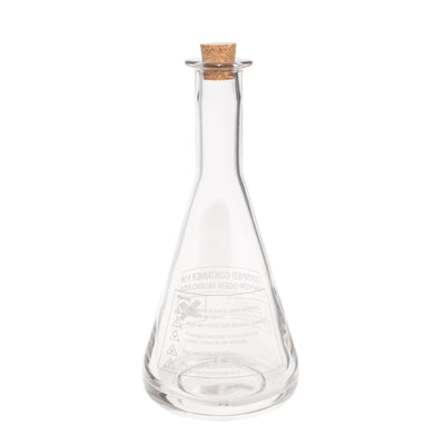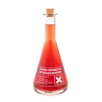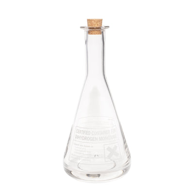 Die Wasserkaraffe DHMO aus Glas sieht aus, als hättest du sie aus einem Chemielabor mitgehen lassen. Der Form nach entspricht sie einem Erlenmeyerkolben, während von außen diverse (wissenschaftlich korrekte!) Warnhinweise aufgedruckt sind. Und damit dein DHMO nicht verunreinigt wird, wird diese Karaffe mit einem Korken zum Verschließen geliefert.