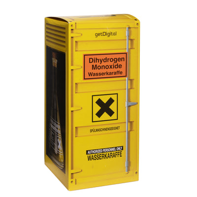 • Die Karaffe ist mit diversen Warnhinweisen versehen, die die Gefahren von Dihydrogenmonoxid (Wasser) aufzeigen