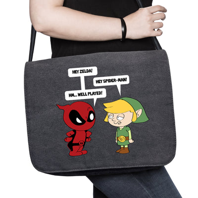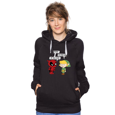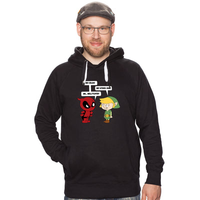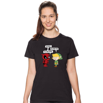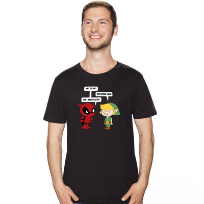 Manchmal kommt es aber auch vor, dass besonders häufig vorkommende Verwechslungen zum Running Gag werden. Das "Zelda meets Spiderman"-Shirt zeigt zwei der bekanntesten: Deadpool will Link damit aufziehen, dass er häufig für Zelda gehalten wird und Link kontert damit, dass Deadpools Kostüm dem seines Kumpels Spiderman auf den ersten Blick ähnelt. Namensschilder würden hier zweifelsfrei helfen...