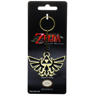 Das Triforce-Logo im Design des 2006 veröffentlichten The Legend of Zelda: Twilight Princess ist aus teilweise lackiertem Metall gefertigt. Es handelt sich um ein offizielles Lizenzprodukt.